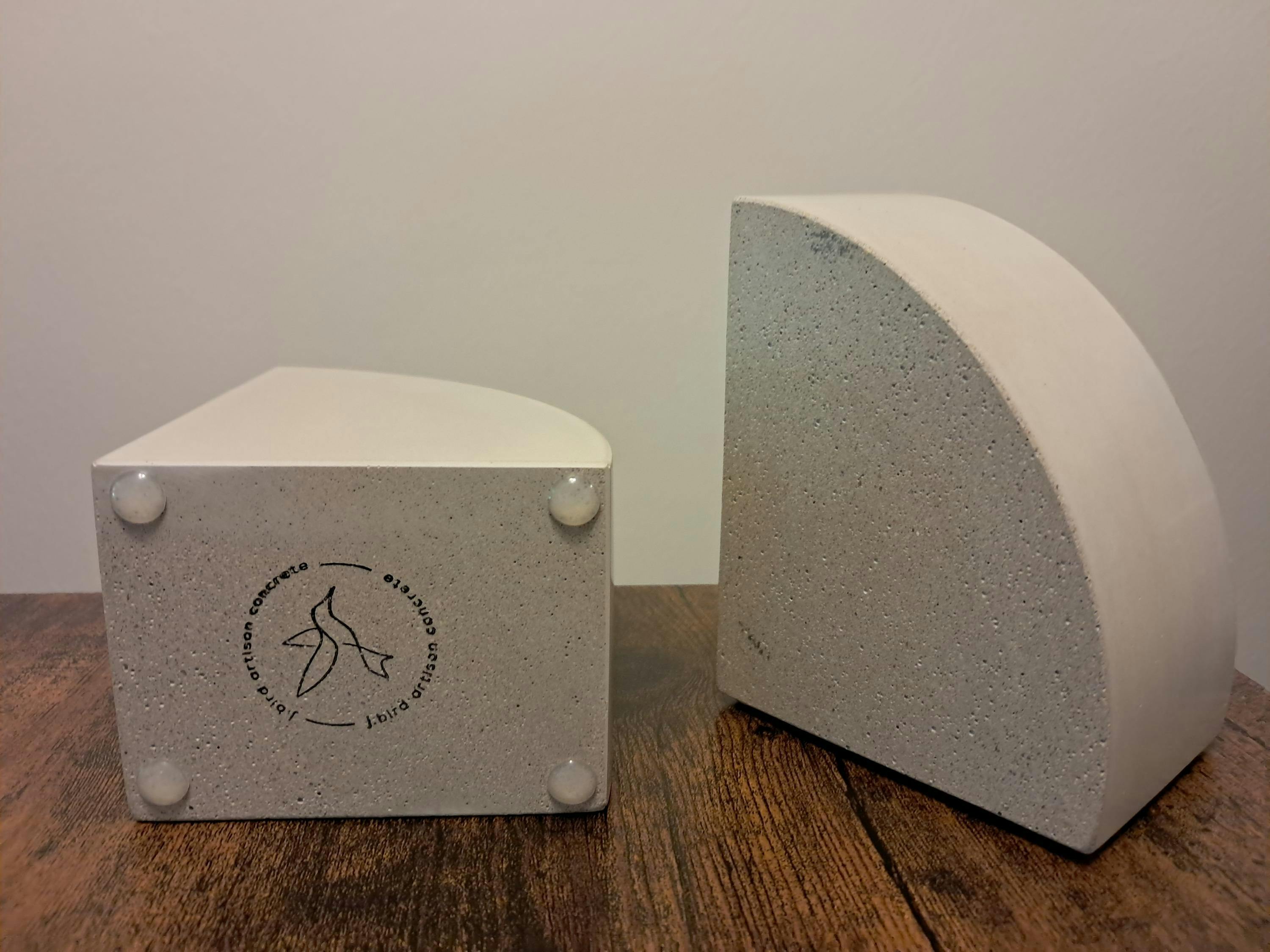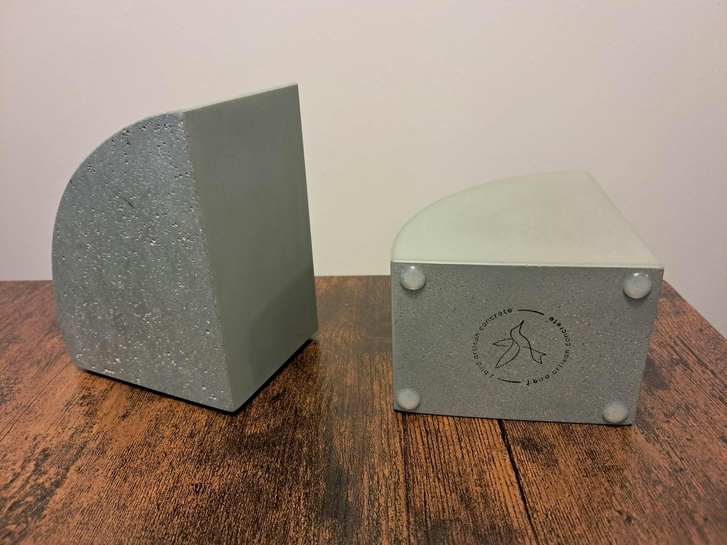 This sleek, minimalistic, and colorful concrete bookend set will modernize any bookshelf. They are heavy-duty and sturdy, weighing in at about 3 pounds each, certain to hold your extensive book collection. The natural look of the concrete will add a modern touch to your home or office, while the rubber pads underneath protect your surfaces from scratches. These are sealed with an acrylic stone sealer and finished with a concrete countertop wax. If you prefer a matte sealer, please add a note to your order requesting this.