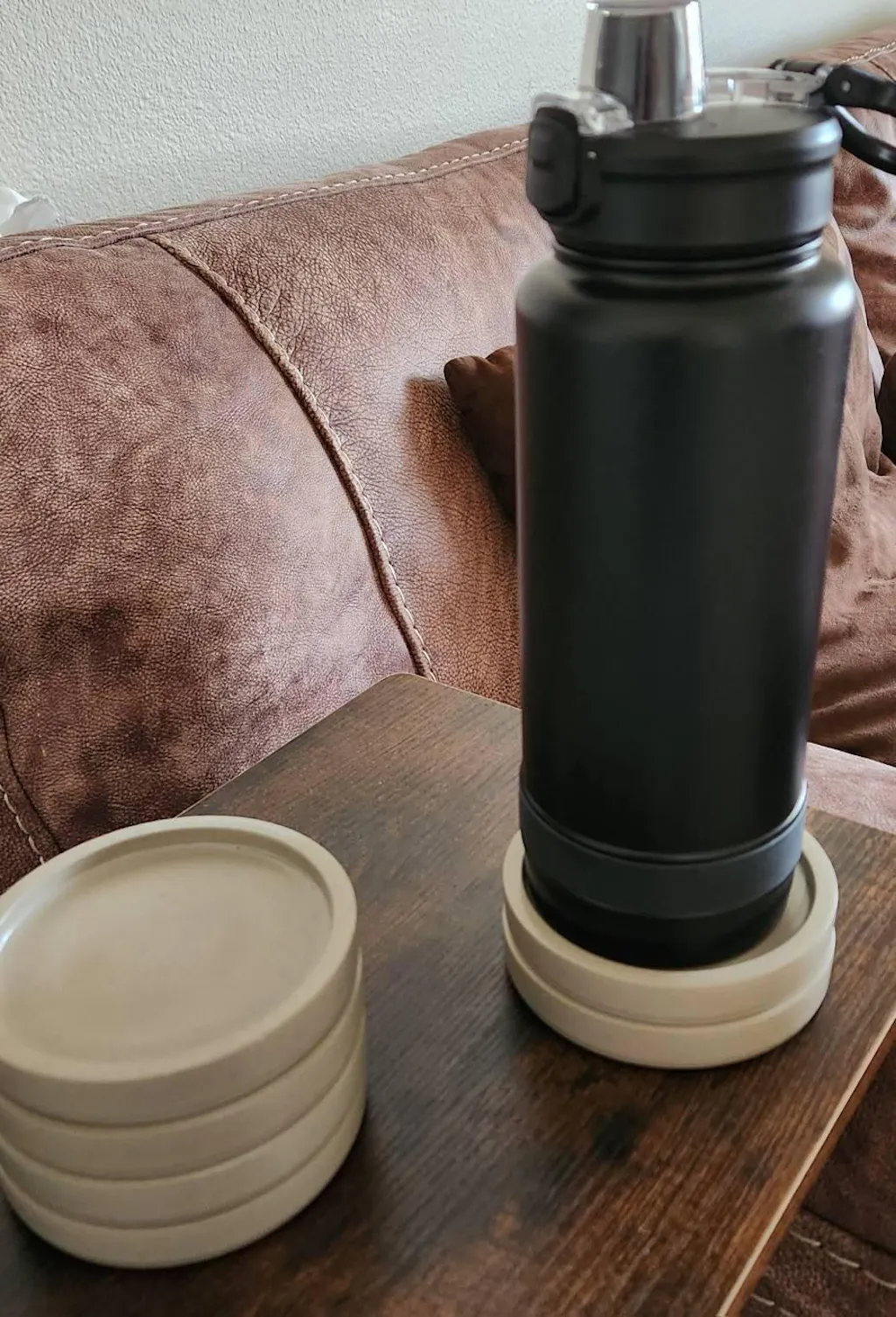 This handmade concrete coaster set of four or six adds a mid-century modern touch while protecting surfaces all around your home. These hand-crafted set of 4 drink coasters are designed with a small lip so condensation is trapped in the coaster. They are linked with a cork bottom to protect your surfaces from scratching. The natural look of the concrete will add minimalist style to your entertaining.