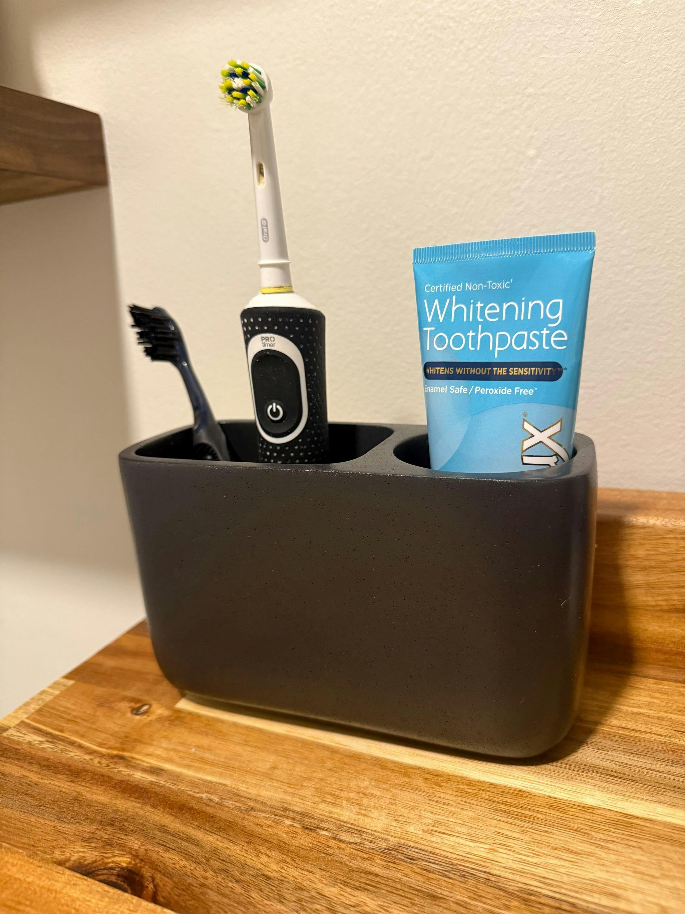 Add a modern look to your bathroom with our handmade concrete toothbrush caddy. It can hold 2-3 standard toothbrushes and space for a toothpaste tube on the other. The natural look of this concrete bathroom accessory will add a minimalist touch to your home, while the rubber pads underneath protect your surfaces from scratches.
